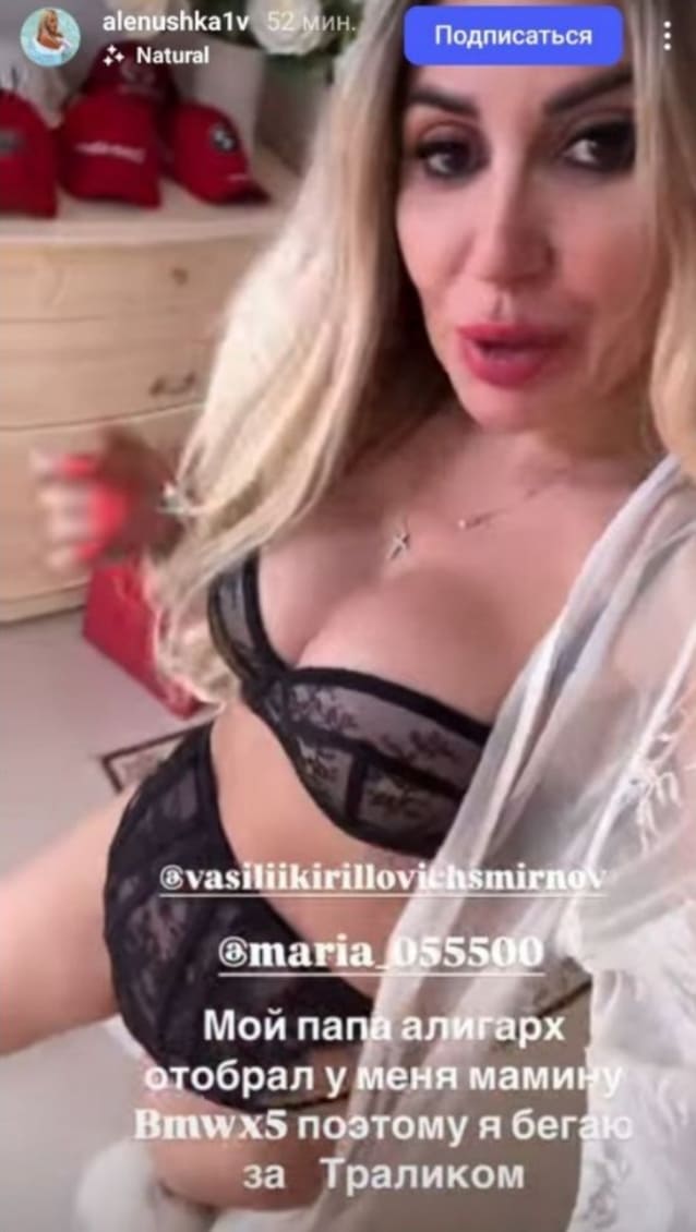 В Instagram @alenushka1v Аленушка делится моментами из повседневной жизни, модными находками и вдохновляющими цитатами. Она описывает себя как человека, который «живет, творит, дышит, кайфует и остается собой — настоящей, смелой, яркой» .